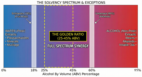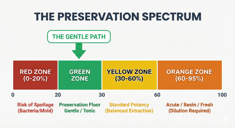 There is a misconception in modern herbalism that "Stronger is Better." This leads to 60% alcohol tinctures that burn the mouth and trigger the gag reflex, causing the user to stop taking them. This is a failure of compliance. True mastery is tuning the solvent to the Human Reality. For Tonics, Adaptogens, and sensitive constitutions, the 20-30% Green Zone is the superior choice—providing a shelf-stable, water-soluble extraction that invites daily consistency rather than resistance.