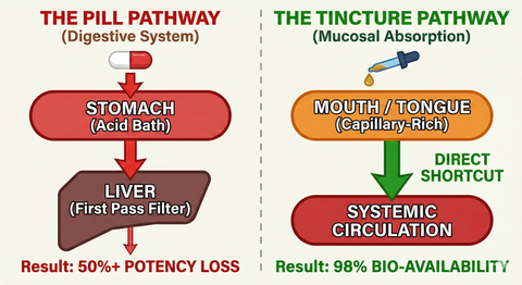 When you swallow a pill, it must survive an acid bath and a liver filtration process known as the "First Pass Effect" before it ever reaches your blood. Tinctures bypass this system entirely. Discover the physiology of the Sublingual Highway and how liquid extracts communicate directly with your nervous system.