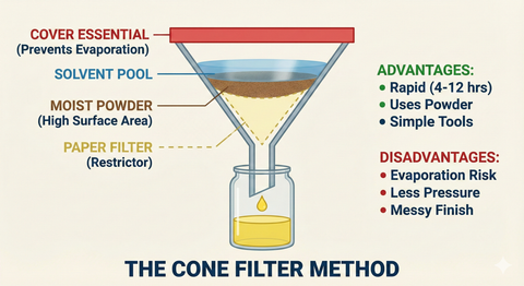 The "Field Medic" Protocol. Sometimes, you don't have 6 weeks to wait for a maceration, and you don't have a glass lab column for a full percolation. When the need is immediate, we turn to the Cone Filter Method. Discover how to turn a simple funnel and paper filter into a rapid extraction engine that delivers finished medicine in under 12 hours.