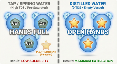 Tap and Spring water are loaded with dissolved solids (earth minerals, chlorine, pipe residue). In extraction physics, this means they have "low solubility potential." To pull the maximum amount of medicinal minerals from a plant, you need an "Empty Vessel." Discover the physics of the Dielectric Constant and why Distilled Water is the only choice for serious herbalism.