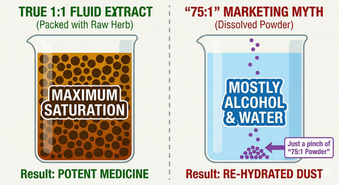 Liquid solvents have a physical limit to how much they can hold before they become saturated. So how do companies claim "20:1" or "75:1" liquid extracts? They don't. Discover the Law of Saturation, the math of Weight-to-Volume (W:V), and the difference between a true Fluid Extract and a "Dissolved Powder" suspension.