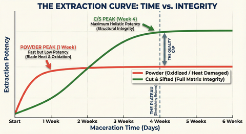 Time is an ingredient, but patience has a limit. There is a belief that the longer a jar sits, the more potent it becomes. The physics of Equilibrium disagrees. Once the liquid is as full as the herb, the extraction stops. Discover the "Saturation Curve"—why Powder extracts in days (but lacks soul), why C/S takes weeks (but holds the matrix), and why waiting 6 months is just waiting.