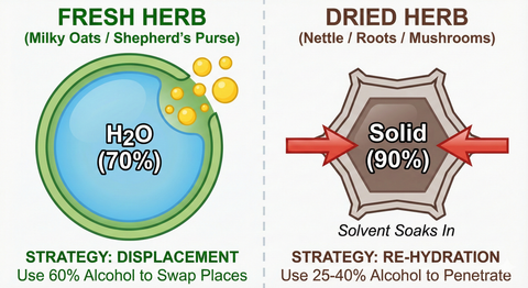 In herbalism, water is not just a liquid; it is a structural component. A Fresh Plant is a hydraulic system, requiring a specific 60% ABV solvent to displace its living juices. A Dried Plant is a condensed archive, requiring a lower 25-40% ABV to rehydrate and release its minerals. To choose the right method, you must understand the Hydro-Dynamic Status. We reveal the herbs that must be tinctured fresh to work, and the ones that only reveal their true power after drying.