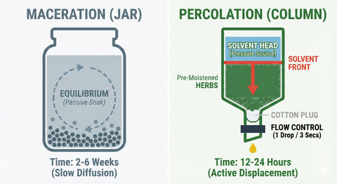 The Jar waits. The Column works. Maceration is a passive process that takes weeks. Percolation is an active process that takes hours. Learn the Glass Column Protocol—how to use a simple modified bottle or lab cone to engineer a "Solvent Front" that mines 95% of your herb's potency in a single day.