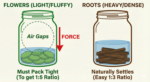 This is the "Volume Paradox" of herbalism. Light, fluffy herbs (Flowers/Leaves) take up massive space, requiring you to Pack Them Tight to achieve a potent 1:10 extraction. Dense, heavy herbs (Roots/Barks) settle naturally, allowing for incredibly concentrated 1:3 Ratios. Mastering the Menstruum means understanding how to physically manage the plant material while tuning your solvent for the ultimate goal: Daily Tonic Nourishment or Immediate Systemic Stimulation.
