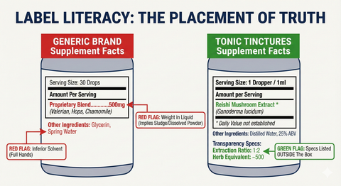 The industry plays a shell game with numbers. They put "500mg" inside the box to make you think you are getting solid mass, while using "Spring Water" that is chemically unable to hold that much medicine. True sovereignty requires Label Literacy. In this guide, we teach you how to distinguish a "Dissolved Powder" from a "True Fluid Extract" by decoding exactly where the numbers sit on the label.