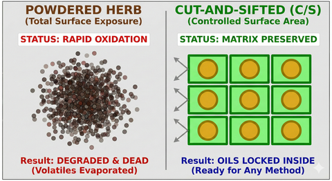 To extract the "Soul" of a plant, you must preserve its body. The moment an herb is pulverized into powder, it undergoes rapid Oxidation, destroying the very oils you seek to capture. Discover the engineering of the "Living Chunk" (Cut-and-Sifted) and why it is the superior material for any extraction method.