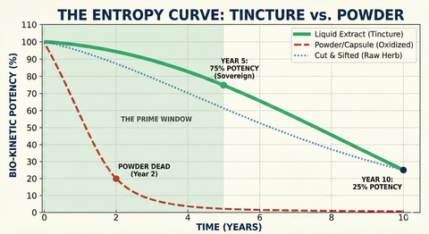 Most supplements have a secret expiration date—not the one printed on the bottle, but the one dictated by physics. The moment a plant is powdered, it begins to die. Surface area is the enemy. There is only one method that effectively fights the Second Law of Thermodynamics: Hydro-Ethanolic Preservation. In this article, we explore the science of Temporal Integrity and why liquid extracts remain the only viable "Survival Asset" in your apothecary.